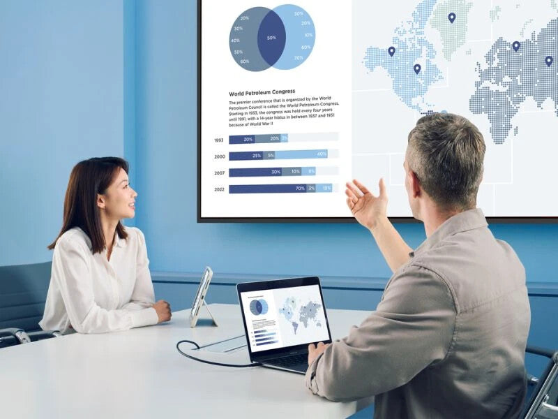 This presentation display supports BYOD in classrooms and meeting rooms with USB-C (DP1.2, HDCP) and HDMI 2.1 ports, allowing both guest and internal users to connect personal devices and share content securely without accessing the internal network.