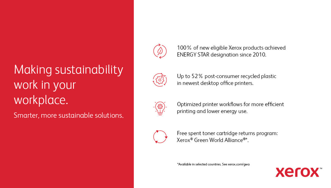 Ready to take the hassle out of hard work? The Xerox® C410 Color Printer provides everything you need and nothing you don’t to get more done — right-sized functionality, fast print speeds, high-quality color output and optional Wi-Fi. Perfect for small to midsize work teams that need dependable printing, the C410 Printer is ready for business right out of the box. The Xerox® Easy Assist App provides guided Wi-Fi setup from the convenience of your mobile phone. That means you get on with your day and start printing in minutes and not hours — all with minimal IT support. Conveniently compact and quiet, time and office space are at the top of your list of priorities. And now you can get more out of both. Ideal for point-of-need and tight office spaces, the C410 Printer is quiet, lightweight and has a small footprint. Whether it's under a counter, at a reception area or on a desk, these right-sized printers fit exactly where you need them. Think you need to call IT for maintenance or troubleshooting? Think again. Advanced tools such as Xerox® Easy Assist, Xerox Print Drivers, and the Xerox® Print and Scan Experience provide enhanced productivity features and offer a better way to install, use, monitor and manage your printer. In addition, the C410 Printer is made for mobile workers like you with built-in support for Apple® AirPrint®, Mopria and optional Wi-Fi Direct®. And, with the ability to print Microsoft Office files directly from a USB drive, it's even easier to keep work moving. Shrink your eco impact with the C410 Printer. Made from up to 25% of post-consumer recycled plastic, these printers meet or exceed the highest global standards for environmental performance, including ENERGY STAR and EPEAT®. They minimize paper waste with Earth Smart Printing, and the Xerox® Green World Alliance® program simplifies collection, reuse, and recycling for spent imaging supplies.¹ Print quality that can’t be missed, the high resolution of the C410 delivers vibrant colors, crisp text and sharp lines so your important documents look their best.