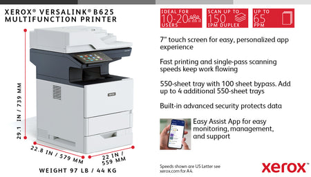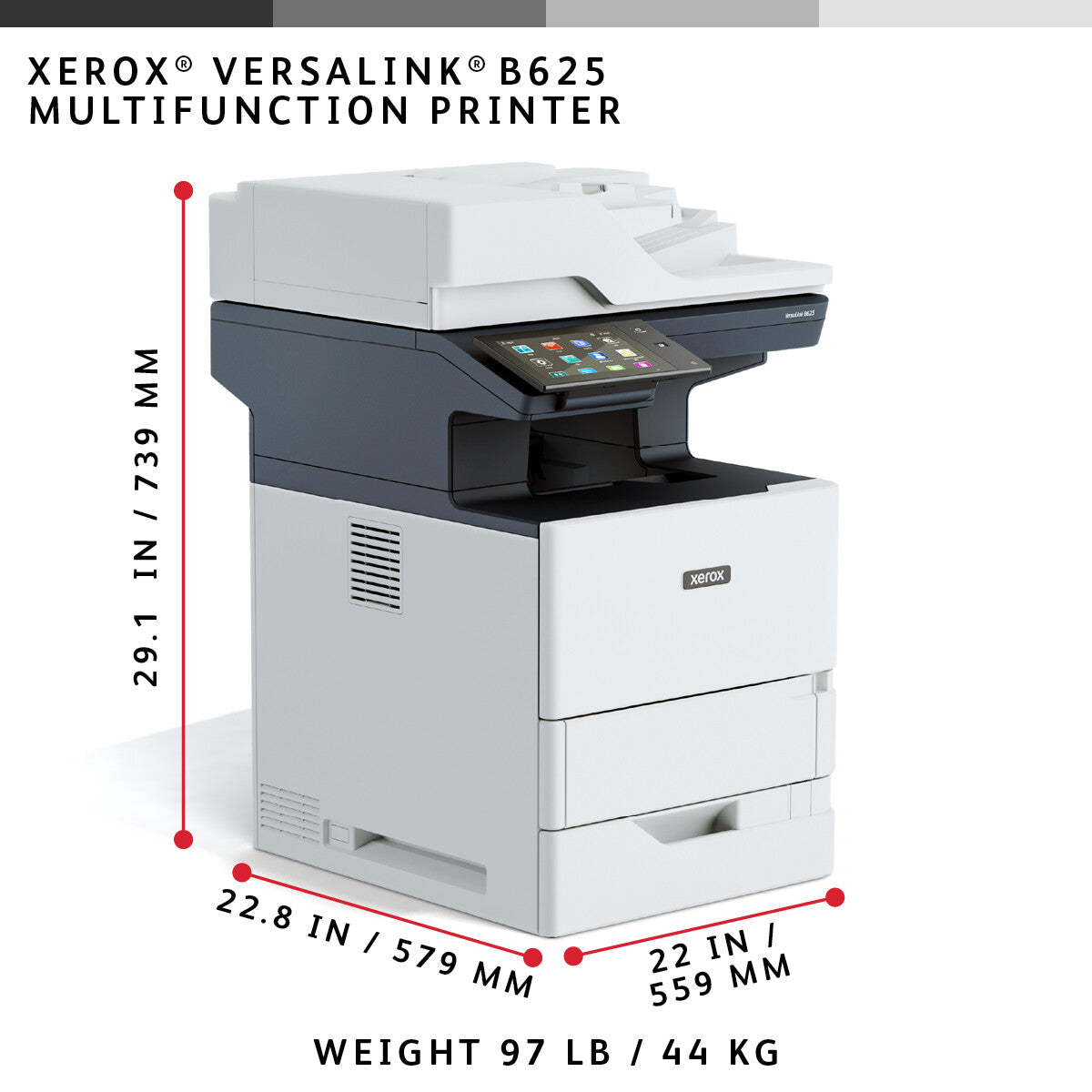 The Xerox® VersaLink® B625 Multifunction Printer is the total package for your office environment. It is small enough to fit where you need it and fast enough to support high print and scan volumes. The VersaLink B625 delivers fast printing — up to 65/61ppm Letter/A4 with first-print-out time as fast as 4.4 seconds. So there’s more than enough speed to meet your demanding department-level workload. With the VersaLink B625, your documents receive outstanding monochrome image quality and crisp text output with high-resolution output of 1200 x 1200 dpi. Use the Easy Assist App to simplify installation, monitor and manage your VersaLink right from your mobile phone. It assists with the installation of the latest driver software for your MFP on your computer, provides real-time monitoring of printer status, and delivers easy access to self-support services. With Xerox® Global Print Driver® you get a single print driver that is truly universal, it lets IT administrators install, upgrade and manage Xerox® and non-Xerox Devices from a single driver. The ConnectKey Technology Ecosystem on the VersaLink B625, opens a world of new capabilities with apps, innovative partner solutions and customization. Create customized workflows, automate complex tasks, print and scan directly to and from your cloud services.