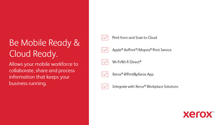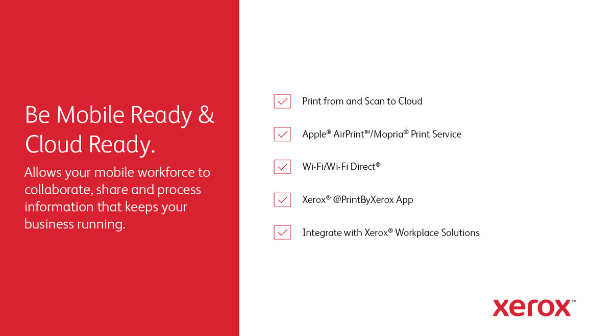 Uncompromising Productivity, Reliability and Security: Your work continues to demand more — greater mobility, better security, and simpler ways of getting more done. That’s why next-level capabilities come standard with the Xerox® VersaLink® C415 Color Multifunction Printer (MFP). Powered by advanced Xerox® ConnectKey® Technology, this modern multifunction printer is ready for anything you throw at it — today or tomorrow. Say Hello to More Ease: Easy-to-follow, step-by-step configuration options make setup a breeze, so you can get up to speed and back to work in minutes, not hours. The Xerox® Easy Assist App simplifies installation, monitoring and management of your MFP from the convenience of your mobile phone. Powering Productivity: The intuitive touch screen interface is your on-ramp to the ever-expanding Xerox App Gallery, home to a wide variety of apps to take your Workplace Assistant even further. This allows the C415 MFP to adjust to the needs of your organization, even the ones you don’t see coming. For example, the Easy Translator Service App can translate scanned documents into several different languages in a snap. Smart, Multi-Layered Security: Even security is simpler with the C415 MFP. Built-in features and comprehensive services that work hard to keep data and documents safe by preventing unauthorized access, detecting suspicious or malicious behavior and staying ahead of threats. Made for Modern, Mobile Work: You’re always on the go, and your Workplace Assistant can help you stay that way. Work when, where and how you want with access to your favorite cloud storage platforms, including Google Drive™, Microsoft® OneDrive® and DropBox™, as well as additional options through the Xerox App Gallery. Wireless flexibility makes it easy to print and stay secure and connected no matter what.