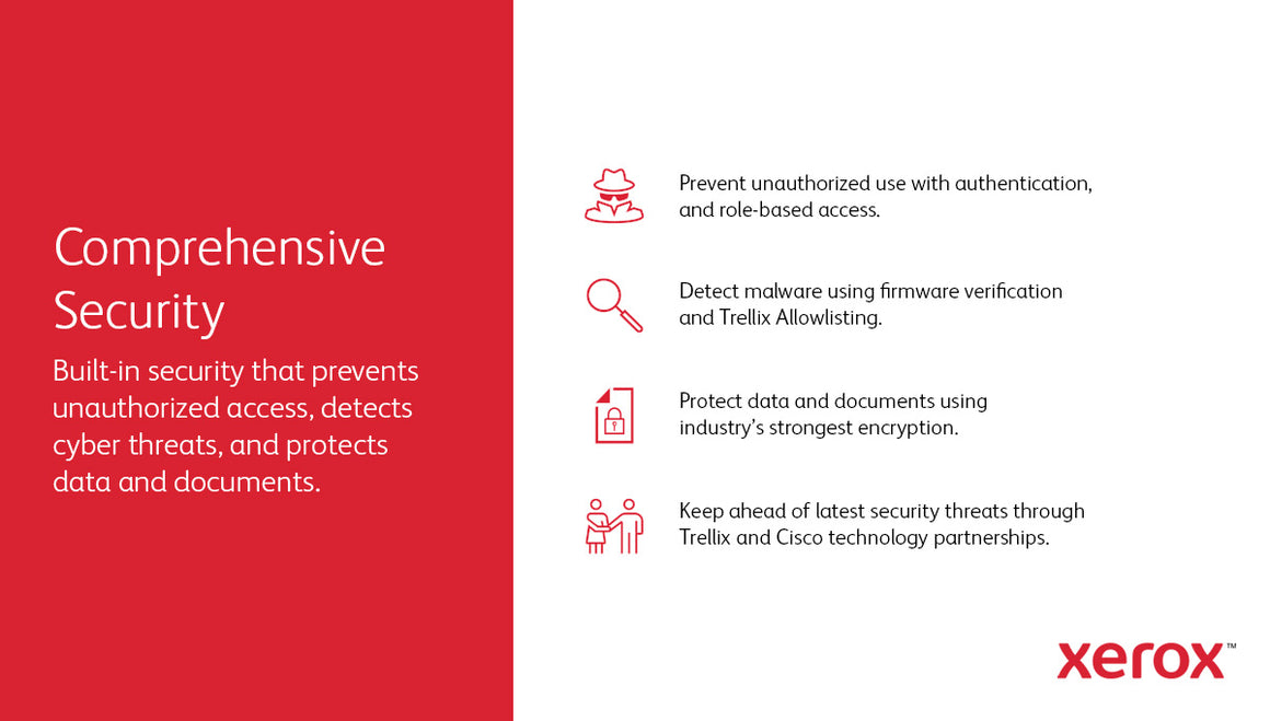 Reliability and performance that exceeds demands and expectations. Is personalization, future readiness and built-in security too much to ask for? Not for the demands of modern work. Small enough to fit where you need it and fast enough to support high print volumes, the Xerox® VersaLink® C620 delivers flawlessly for high-performing teams with print-centric needs. Compact Without Compromise: Make the most out of every square foot of your office space with the small footprint of the C620. This Workplace Assistant takes up less space but gets just as much work done. It’s perfectly sized for scaled-back office spaces and hybrid work environments, where space is a premium and there’s no room for disruption. Make Work Easier: Get up to speed in no time with a tablet-like touch screen that balances simplicity and time-saving efficiency. The familiar, intuitive 5-inch user interface (UI) guides you through tasks, and simplifies every print interaction, making viewing printer status and submitting or releasing print jobs quick and easy. Mobility features, such Apple® AirPrint®, Mopria, and optional WiFi Direct¹, take the stress out of printing directly from your favorite mobile devices. And Xerox® @PrintByXerox provides hassle-free printing from any email-enabled device (smartphone, tablet, computer, Chromebook) via the cloud, so you can print easily and securely from anywhere. Disruption-ready Technology: Your work is always evolving, so you need technology that's always a step ahead. The Xerox® ConnectKey® Technology-enabled VersaLink adjusts quickly to the evolving needs of your organization. Advanced tools such as Xerox® Easy Assist, Xerox® Print and Scan Experience provide enhanced productivity features that deliver easier ways to use and manage your printer. And with access to a portfolio of cloud-hosted apps via the Xerox App Gallery you can effortlessly connect and print from popular cloud repositories directly from the C620 user interface. Smarter, More Sophisticated Security: The Security Dashboard simplifies printer security management on the VersaLink C620. A comprehensive range of proactive security features stop security threats where they start, preventing malicious attacks, proliferation of malware, unauthorized access or changes, and breaches that lead to downtime. To simplify security event reporting and management, VersaLink Devices can integrate with Security Information and Event Management (SIEM) Tools. Proactive features constantly monitor, detect and block threats in real time. And automated security responses provide invaluable time savings and peace of mind. Quality That’s a Cut Above: Delivering a high-resolution output of 1200 x 1200 dpi, with crisp text and sharp lines to elevate your important documents with outstanding vibrant color. Sustainable Through and Through: Made up of more than 25% post-consumer recycled plastic, the VersaLink gives new meaning to environmental responsibility. This device meets or exceeds the strictest, globally recognized standards for product environmental performance, including EPEAT, Blue Angel and ENERGY STAR®. In addition, the Xerox® Green World Alliance® program simplifies collection, reuse and recycling of spent imaging supplies, and we are working to minimize the waste associated with our devices.