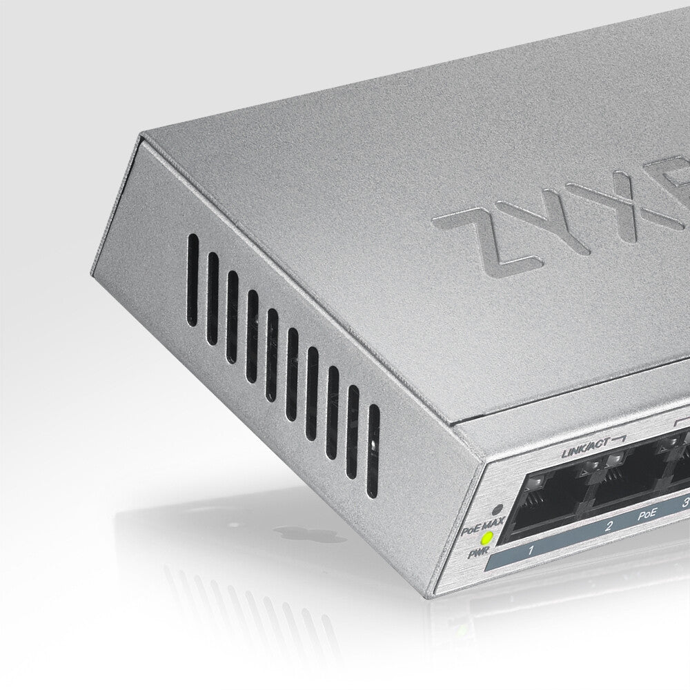 The Zyxel GS1005HP is equipped with 5 gigabit Ethernet ports, 4 of which are PoE ports that can deliver up to 60W of total PoE budget. The GS1005HP can easily connect with PoE ready devices to your network with plug-and-play design while providing power-saving benefits without compromising performance. The GS1005HP fills a long-standing hole in the market for unmanaged PoE switches that feature the 802.3at standard, has a high power budget and are affordable for SOHOs and small businesses.